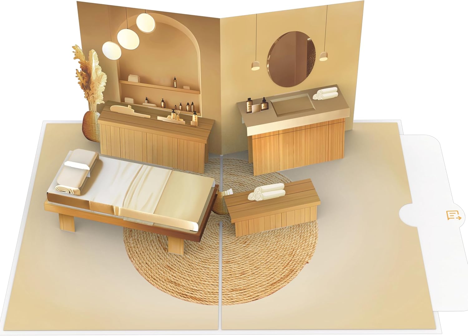🧘♀️ LA ANTESALA DE LA SERENIDAD: En cuanto se abre, el mundo exterior se detiene. Una escena tridimensional dedicada al bienestar florece desde el papel, invitando a la calma y anticipando un momento de pura paz. Es el preludio perfecto para una experiencia sensorial.