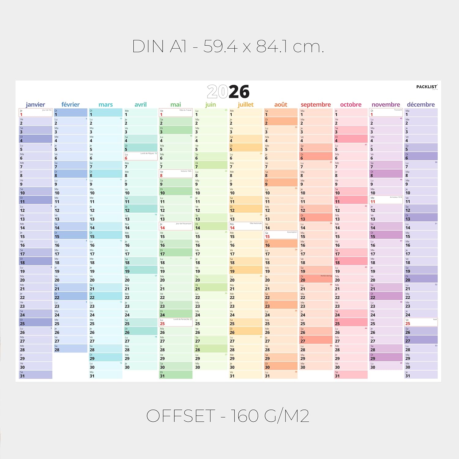 PACKLIST® Calendrier Mural 2026 XXL | Planificateur A1 Jours Fériés France